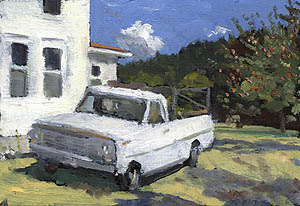 4 GREAT WAYS TO SUPPORT THE ARTS: From a $2 greeting card to a $35 print to an original painting or a painting commission ranging from $350 to $3500, you can help keep the arts and the Itinerant Artist alive, while getting something unique, beautiful and soulful for yourself or someone you like a lot: Check out the Gift Shop, Print Portfolios and Commissions links, or contact me directly. New for 2007: Three coastal scenes and several new 2007 Tour scenes have been added to the selection of Itinerant Artist Project Giclee Prints now available through this website. All sales support the Itinerant Artist Project. FEATURED PAINTINGS: Above left is Lopez Island #1: White Truck, painted on the first week of the latest IAP Tour. Check out the 2007 Tour link for more images. Next at left is Cody, WY #5: Irma's Grill. Another bar in town, Cassie's, welcomed my offer to trade art for a meal; a headwaitress at Irma's turned me down and missed the chance to get this painting. Shown at lower left is October Beach, done at Isabella Beach on Fishers Island during the 2006 IAP tour. All originals are oil on panel, about 6" x 9", 4" x 6" and 6" x 9". These images are also among the latest additions to the IAP print collection . Signed, limited edition, archival prints of these and several other paintings are available, framed or unframed. Just follow this link to: Fine Art Prints. |