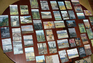 55 Panels, Before and After This is a side-view of the stack of panels I took on my last tour. They are primed with gesso of different colors ( I have published articles about painting on colored gesso). After snapping this shot, I headed to the airport with a one-way ticket to Seattle and license plates for a '98 Chevy Prizm I'd bought on CraigsList Seattle. This was the latest strategy for throwing myself way outside my comfort zone and into an art road trip with no easy retreat. The reality of touring is always highly unpredictable and highly demanding, especially given my tendency to be socially retiring, to dread long drives, to dislike being uprooted and to sleep terribly in unfamiliar places. On top of all that, there's the inherent uncertainty of art itself: I really never know if I'll be able to paint adequately on any given day, yet alone 40 days more or less in a row... But with a road trip, as with a painting, I like finding out what happens. I like finding out that, in fact, in spite of it all, I have the ability or the openness to let it work. That may be one of the deeper motivations behind my painting, as well as my art trips. |