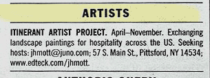 Classified Ad The means by which people hear about my project and decide to invite me have expanded along with media coverage*. Mostly, though, I have relied on email chain letters (not the bad luck kind); classified ads; word of mouth and my web presence. More recently, when needing a host in a target location, I have tried cold-calling art departments, reference librarians, museums, etc. *an aside: My interview on Canadian public radio led to several dozen invitations, including one from the Gaza Strip. "You might have trouble getting back out, but you'd have an interesting time," she wrote. |