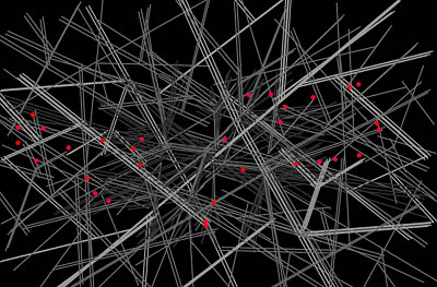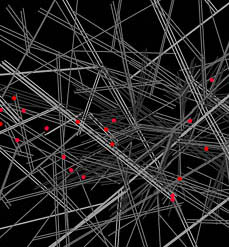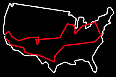 Graphic for the First Tour The mesh in the diagram above is arbitrary but suggestive. The red dots could be random but correspond to the map locations for the 32 stops on my first Itinerant Artist tour. Connecting the dots shows my route. This graphic became a logo for my project. |