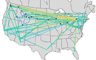 Map of the 2007 Tour, with selected email networks To some degree the location of my stops is indeed random, the end result of a few rolls of the dice, so to speak. My favorite part of the tours is the finding of hosts: casting a net, observing how the process works, and seeing where on the map I get to place the next dot, the next stop in my itinerary. This graphic shows pathways for some of the tour announcement emails I sent out for the 2007 tour; where those got forwarded and who ended up responding. |