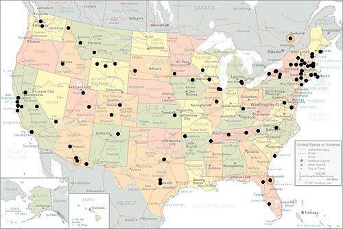Map above shows all the IAP tour stops from the first several tours, plus a few places (circled in orange) that I stayed by special invitation, outside the context of a regular road trip.