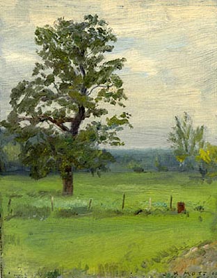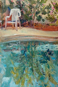 Edge of the City was the fourth of five paintings Mott completed on his second day in Salt Lake City. "It was an unusually good day," he said. "This scene caught my eye as I was heading back late for dinner. It brought back childhood memories of Tucson. And I liked the thought of painting a night scene with so much color." ![]() The Irma Grill was the first place Mott tried to barter a painting for a meal. "I was stuck in Cody, Wyoming with an absentee host and no food. I didn't want to spend money, so I gave it a shot." The head waitress turned him down, but he had better luck at a cowboy bar down the street. Later he went back and painted this scene, anyway, because he liked the shapes and colors of the signs. ![]() Mott painted this study called Wisconsin Oak within minutes of arriving at an old farmhouse in Stoughton, Wisconsin. He finds he can relax and settle into his visits more happily if he gets some of his work out of the way at the start. ![]() Afternoon Kitchen was painted in Litchfield, Connecticut, but a print of this scene made it into a Montana courthouse last fall, when a traffic court judge accepted it as payment for a speeding fine. "I consider that judge a creative hero of the highest order," says Mott, "and he forever re-defined the term 'fine art.'" ![]() Chair by the Pool was painted in Las Vegas, after a day touring the strip with his host. "She didn't leave me much time for painting. When we got home I set to work on the first scene I could find with any interest." He worried that she might hate it, but the opposite was true. "She was delighted to see something so familiar turned into a work of art. It was one of the most rewarding responses I've ever had." ![]() Mott will discuss the Itinerant Artist Project at 7 p.m. Thursday, April 24, at the Memorial Art Gallery. |
